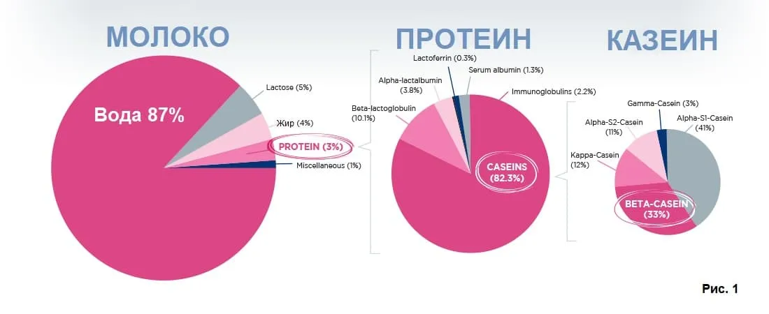 Всем известно, что коровье молоко на 87% состоит из воды и на 13% из сухих веществ (жир, белки, лактоза, минералы). Самая ценная часть сухих веществ – это белки, основным компонентом которых является казеин. Около 30% казеина это бета-казеин. Бета-казеин бывает нескольких видов. Самые распространенные формы бета-казеина: аллели А1 и А2. Их отличие заключается лишь в одной единственной аминокислоте.