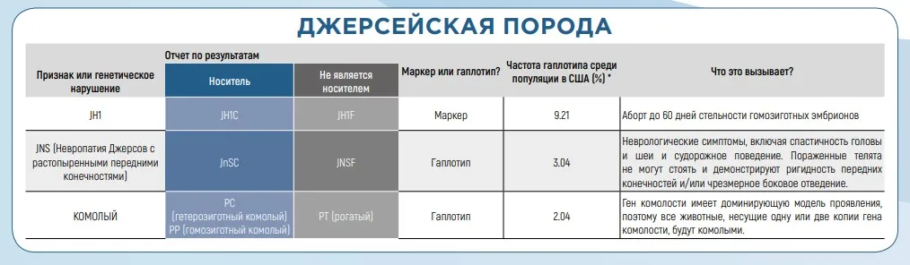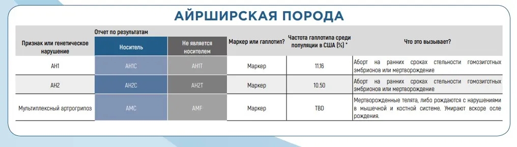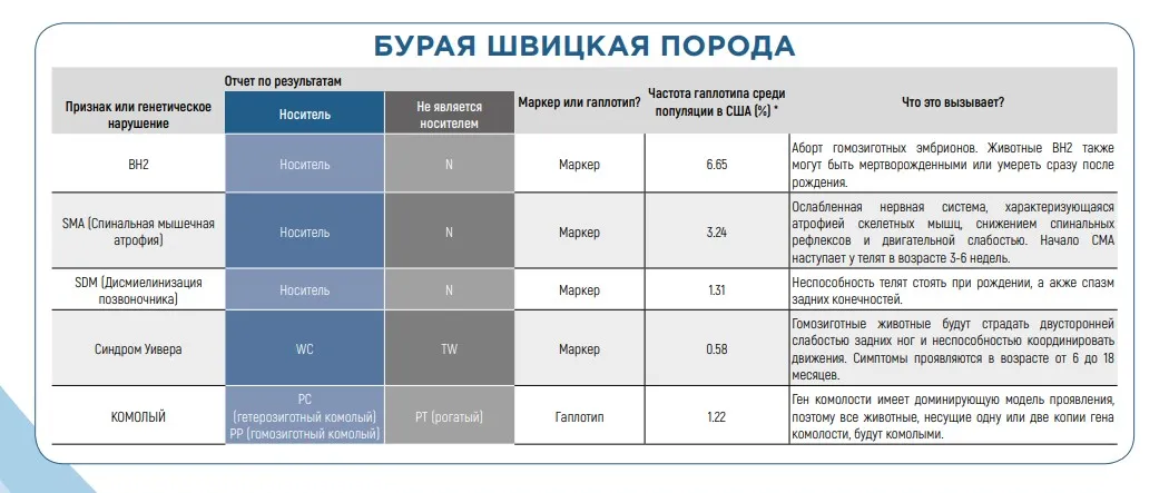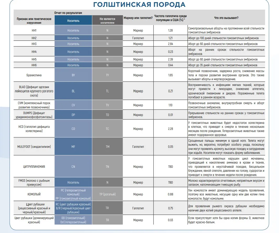 Отрицательные гаплотипы могут встречаться у всех пород крупного рогатого скота, но некоторые могут быть более распространены у определенных пород (как показано в таблицах ниже). Обычно они связаны с плохой фертильностью и состоянием здоровья. Другие признаки, такие как окрас рубашки и комолость, также связаны с рецессивными аллелями. Чтобы растолковать результаты геномных исследований гаплотипов ваших животных или быков, которые вы видите в каталоге быков-производителей, воспользуйтесь таблицами ниже.