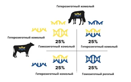 Гаплотип — это сегмент ДНК, который наследуется вместе от одного родителя. Каждое животное несет две копии сегмента гаплотипа, одну унаследованную от матери, а другую - от отца. Особь считается гомозиготной по гену или гаплотипу, когда оба унаследованных сегмента ДНК или аллеля имеют один и тот же генотип, и гетерозиготной, когда две копии имеют разные генотипы. На рисунке 1 показан пример отца и матери, которые оба являются гетерозиготными комолыми животными, что означает, что у них есть аллель для признака комолости и аллель для признака наличия рогов. Вы можете видеть, что при закреплении этих животных, у них есть 25%-ная вероятность получения гомозиготного комолого потомства, 50%-ная вероятность получения гетерозиготного комолого потомства и 25%-ная вероятность получения гомозиготного потомства с рогами.