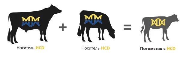 Большинство генетических нарушений связаны с вариантами проявления рецессивных признаков. Рецессивный признак проявляется в потомстве только в том случае, если он унаследован от обоих родителей. Нарушения будут проявляться только у гомозиготных особей, так как животному необходимо иметь две копии гена с определенным генотипом. Особи, несущие одну единственную копию рецессивного генотипа, не будут проявлять фенотип, но, будучи носителем, имеют 50% шансов передать рецессивную копию своему потомству, распространяя нежелательный ген среди стада. На рисунке 2 показана тёлка, несущая гаплотип дефицита холестерина голштинской породы (HCD), она закреплена с быком, который также является носителем HCD. Это означает, что у этой пары есть 25%-ная вероятность произвести потомство, которое проявит HCD. Телёнок с HCD умрет в течение нескольких месяцев после рождения, что повлияет на прибыльность и снизит показатели благополучия стада. Единственный способ узнать о наличии гаплотипов у животных в вашем стаде — это провести геномный тест ваших животных.