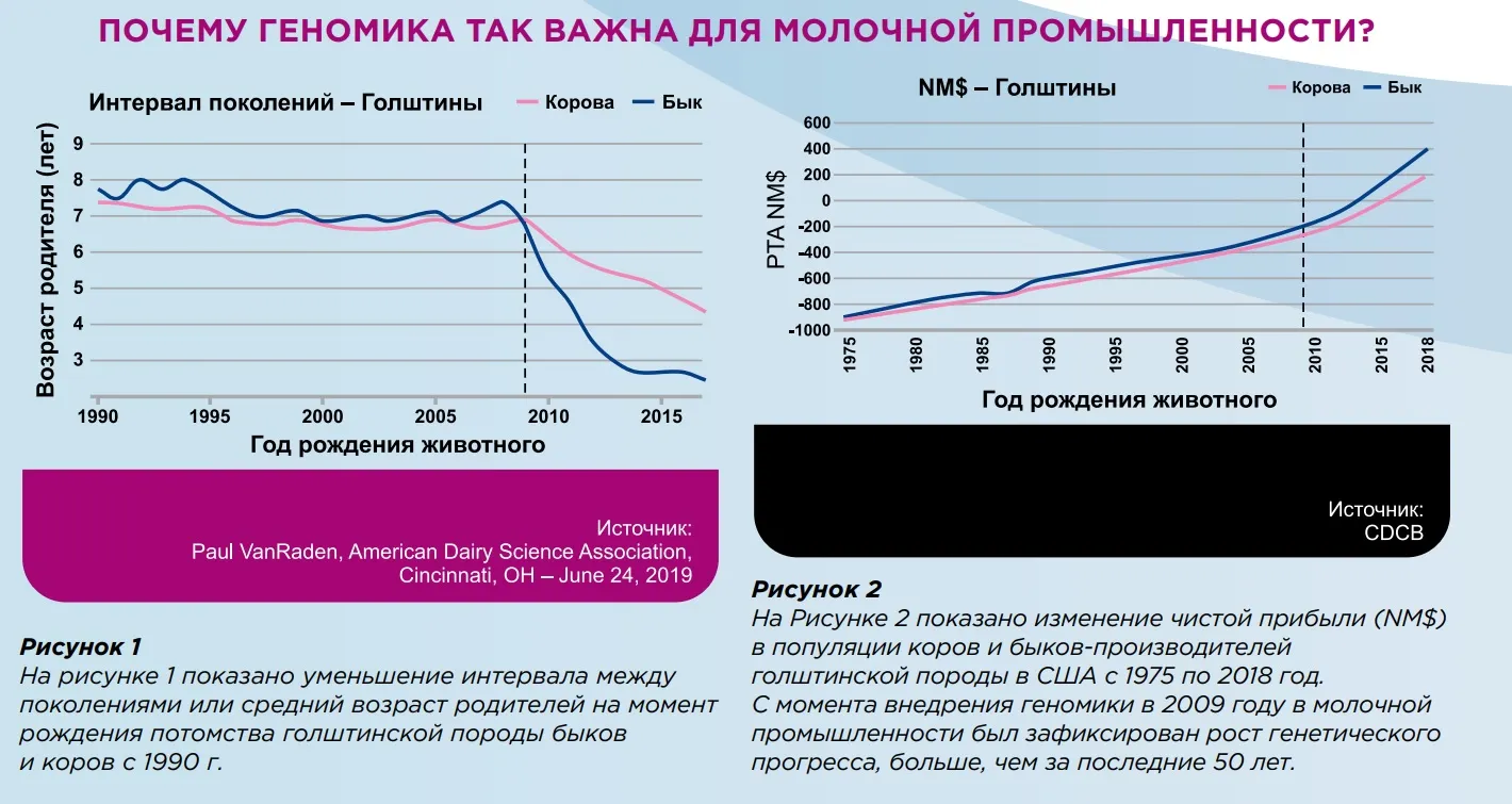Геномика сочетает в себе традиционное племенное воспроизводство животных и молекулярную биологию, чтобы предоставить нам инструмент, который позволяет прогнозировать будущие результаты на животных, которые слишком молоды для тестирования потомства. Существует возможность значительно улучшить генетический результат за счет повышения точности отбора с помощью геномного тестирования. Использование геномики в сочетании с другими технологиями, такими как делённое по полу семя, также может быстро увеличить генетический прирост и, следовательно, прибыльность стада. С момента внедрения геномики в молочную промышленность в 2009 году состоялось значительное сокращение возраста отбора родителей (Рисунок 1), и произошел наибольший генетический прогресс за последние десять лет, чем за предыдущие 50 лет в отрасли, начиная с момента внедрения ИО (рисунок 2).