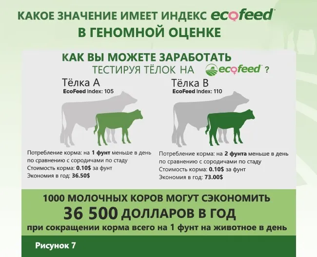 На рис. 7 показан пример тёлок с оценкой EcoFeed 105 и 110 баллов. Тёлка А будет потреблять в среднем на один фунт меньше корма в день (по мере кормления), чем ее сородичи по стаду, что даёт экономию в 36,50 долларов в год. Тёлка Б будет потреблять на два фунта корма в день меньше (по мере кормления), чем ее сородичи по стаду, что позволит ежегодно экономить 73,00 доллара. Если хозяйство на 1000 коров уменьшит количество корма всего на 2 фунта в день на одно животное, это может привести к экономии в размере 73,00 долларов на 1 животное (исходя из стоимости корма в 0,10$ за фунт корма).