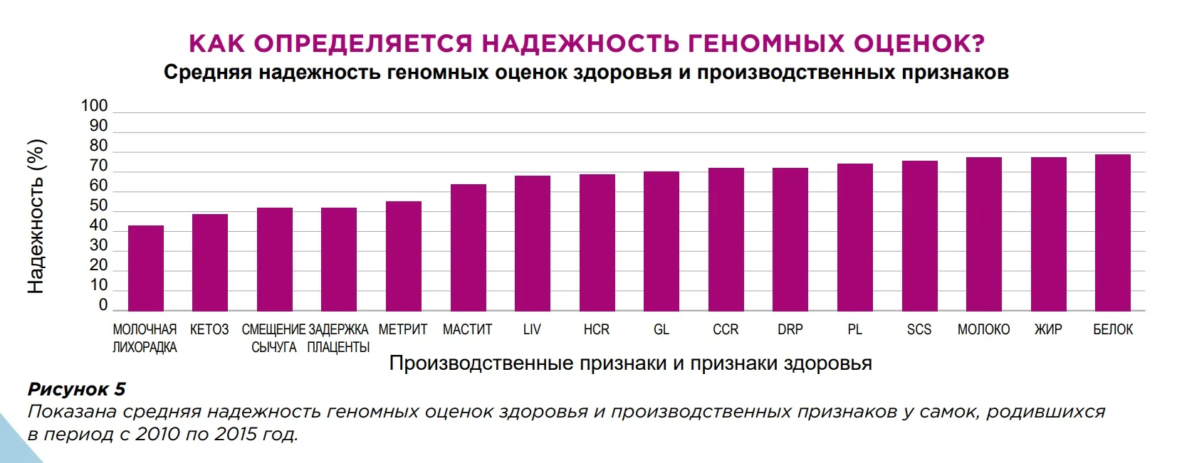 Надежность геномного тестирования — это функция точности и количества фенотипической информации по каждому признаку, оцениваемого в исследуемой популяции, и наследуемости каждого признака. Производственные признаки имеют надежность 75%, в то время как признаки здоровья, которые не имеют большого количества исследуемых, имеют в среднем 50% надежности. Средняя надежность различных признаков показана на рисунке 5.