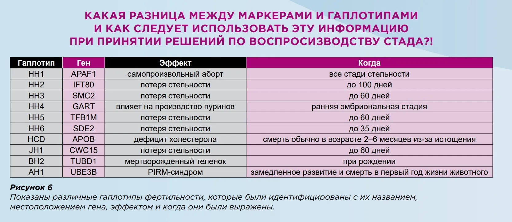 Гаплотип — это часть ДНК, наследуемая вместе, тогда как маркер или тест SNP — это фактическая мутация, которая может вызывать аномалию. Маркер или тест SNP, который определяет фактическую причинную мутацию, более точен по сравнению с гаплотипом, в котором связь с причинной мутацией может исчезать из поколения в поколение. Genetic Visions-ST™ предоставляет наиболее полный набор маркеров в отрасли, и они сгруппированы в три категории: ключевые маркеры молочного белка, генетические аномалии и другие, в том числе маркер доминирующего красного цвета. Вся эта информация чрезвычайно полезна для молочной индустрии, когда речь заходит о принятии точных решений по воспроизводству стада. Полезные маркеры, такие как определенные молочные белки, могут быть идентифицированы и использованы для принятия решений о воспроизводстве, например, о ремонтном молодняке. Отрицательными гаплотипами можно легко управлять в программе STgenetics® Хромосомный подбор пар™, в которой носители одних и тех же отрицательных гаплотипов не будут скрещиваться вместе, и, следовательно, негативные эффекты гаплотипа не будут выражены в потомстве. На рисунке 6 показаны некоторые важные гаплотипы, которые влияют на фертильность и выживаемость телёнка.