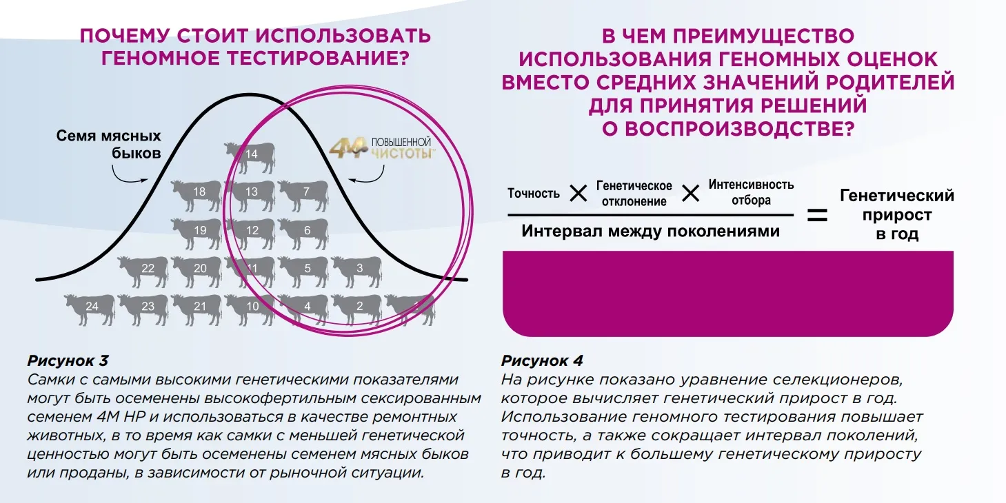 Геномное тестирование предоставляет молочным производителям ценную информацию о показателях продуктивности, типа и здоровья, которая позволяет им ранжировать своих самок на основе генетических качеств. Это позволяет им определить своих лучших ремонтных тёлок и принять другие важные селекционные решения, такие как использование животных с более низкой генетической ценностью для стратегии воспроизводства по программе «Семя мясных быков для молочных стад», чтобы извлечь большую прибыль из мясного теленка-кросса (Рис.3). Геномное тестирование также может включать важную информацию о маркерах и гаплотипах, которые могут помочь молочным производителям увеличивать нужные им маркеры в своем стаде, такие как бета-казеин А2 и BB каппа-казеин, избегая при этом увеличения негативных гаплотипов в своем стаде, которые могут снизить фертильность и, следовательно, прибыльность.
