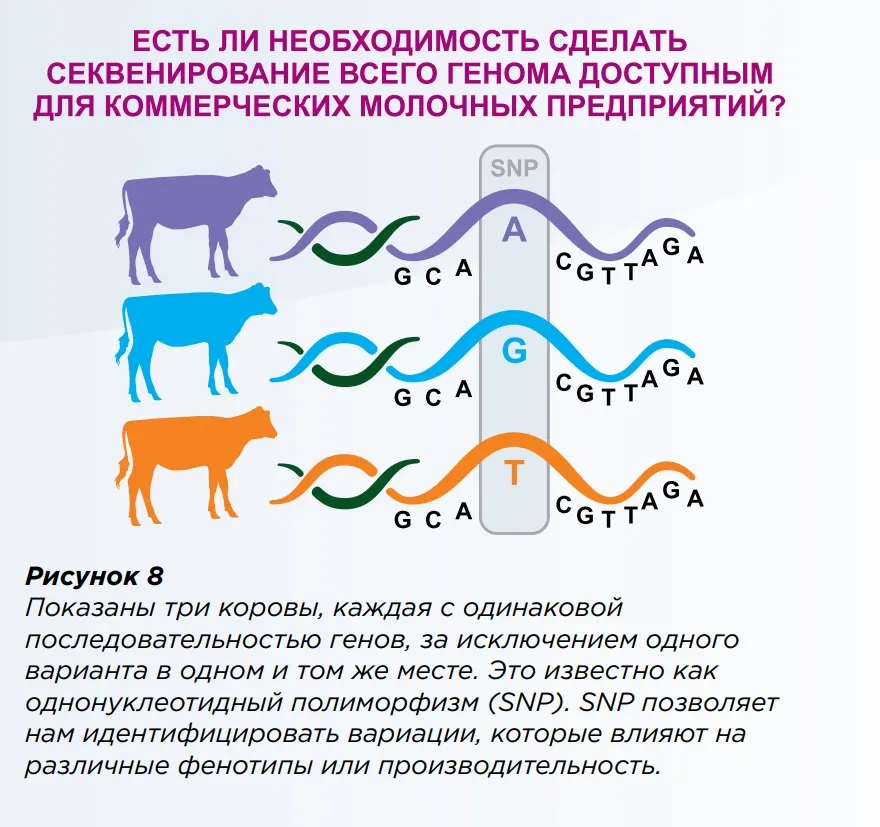 Когда 99% генома любых двух особей идентичны, вам не нужно сообщать о полной последовательности, а только о вариантах. Эти варианты известны как SNP или однонуклеотидные полиморфизмы (рисунок 8). SNP — это разновидность одного нуклеотида в одном месте генома. Эффект SNP можно измерить, оценив фенотип животных, которые имеют одинаковый SNP. Новые технологии, такие как секвенирование всего генома, позволят нам лучше определять варианты и увеличивать объем информации, сообщаемой по каждому гену, и включать новые гены; однако сообщать всю последовательность генома для использования на коммерческих молочных предприятиях нет необходимости.