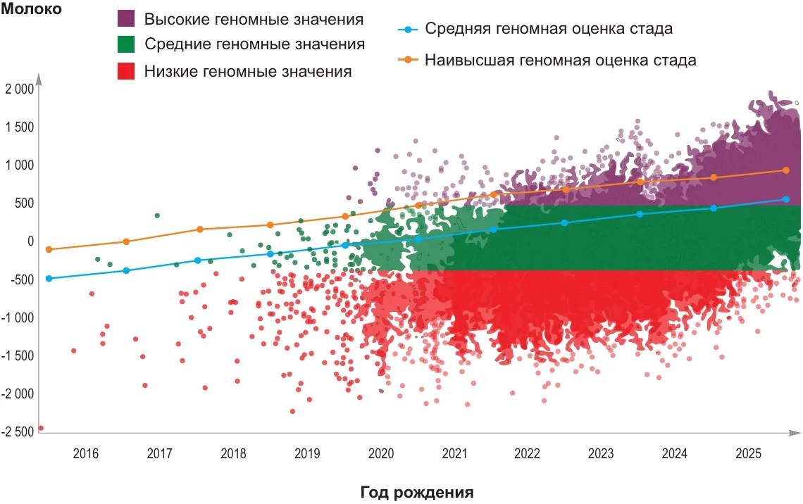 Рассмотрим наглядный пример, представленный на графике. Стрелкой отмечено стадо, в котором началась программа генотипирования животных, родившихся в 2020 году. Участок, обозначенный красным цветом, соответствует наименее ценным животным ("генетическому хвосту"). Геномная оценка была запущена в 2022 году. Фиолетовая область графика выделяет группу лучших животных, пригодных для формирования основы ремонта стада.