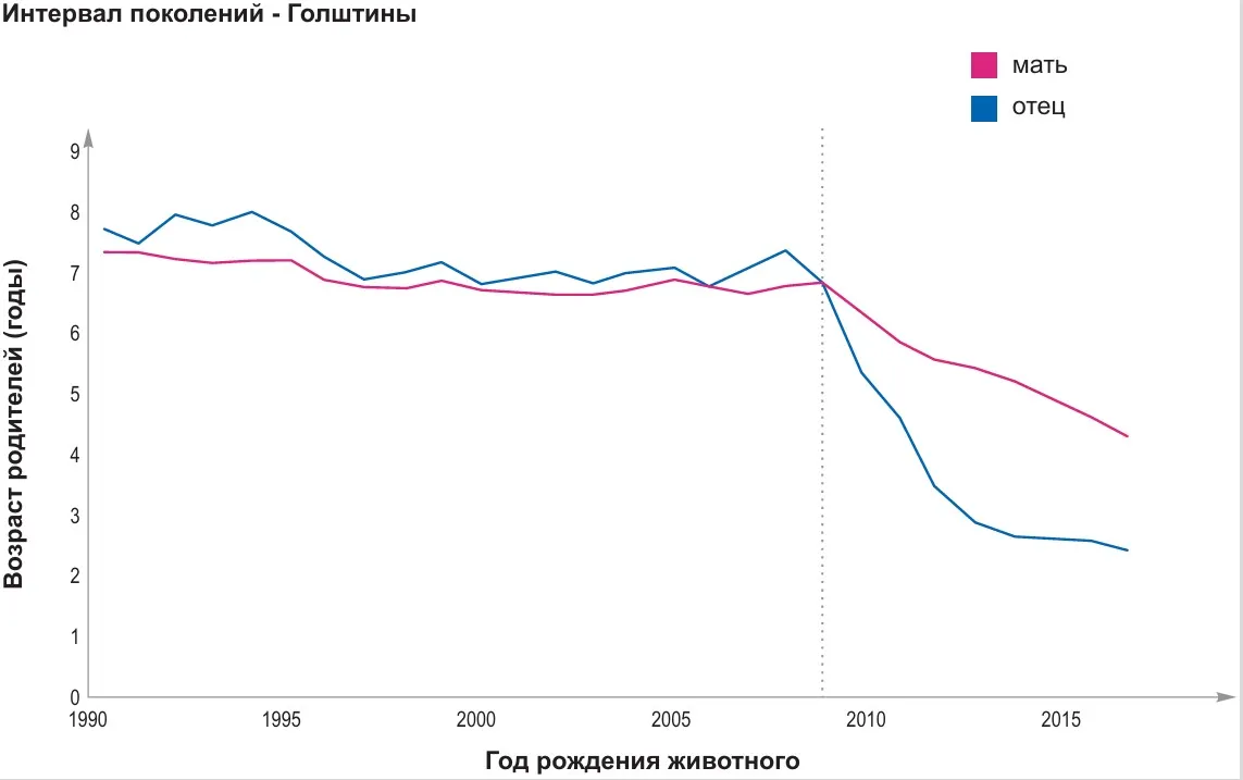 Что касается сокращения интервала поколений, то эволюционный путь последних десятилетий наглядно демонстрирует значительные успехи, достигнутые благодаря внедрению геномной селекции начиная с 2010-х годов. Тогда массовое распространение генотипирования позволило кардинально изменить динамику изменений генетического фонда. Особенно ярко это проявляется в работе с быками-производителями.