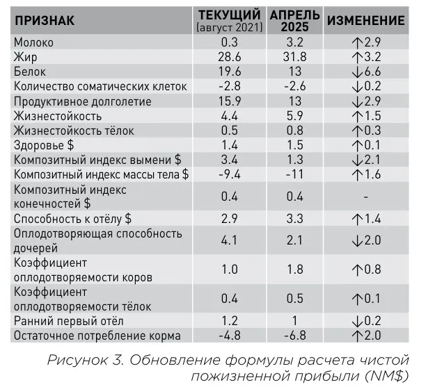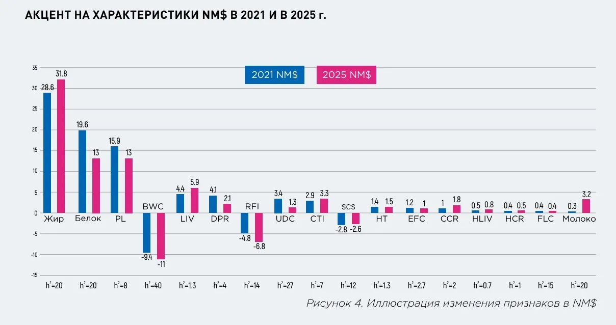 Формула пожизненной чистой прибыли (NM$), рассчитанная CDCB, представляет собой ком плексный индекс, который включает в себя наи более значимые экономические характеристики для ранжирования животных на основе их пожиз ненной рентабельности. Текущая формула вклю чает 12 индивидуальных признаков и 5 составных субиндексов. Изменения в формуле NM$ проис ходят независимо от изменения базы для учета изменений экономических переменных. В пере смотренной версии от апреля 2025 года в формулу NM$ не добавлены новые характеристики, однако акцент на текущих характеристиках изменен с уче том новых оценок значений характеристик и учета переменных доходов и затрат. На рисунках 3 и 4 сравнивается относительный акцент на каждой ха рактеристике в формулах NM$ 2021 и 2025 годов.