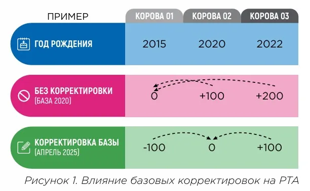 Когда образец генома животного отправляется в исследовательскую лабораторию, такую как Genetic Visions-ST™, ДНК этого животного сравнивается с эталонной популяцией или группой животных с данными о производстве, со держании и/или классификации в Национальной базе данных кооператоров CDCB. Это позволяет CDCB делать про гнозы относительно прогнозируемой передающей способности (PTA) данного животного или того, как это животное будет влиять на многие производственные, репродуктивные, типовые характеристики и показатели здоровья. Эта эталонная популяция обновляется каждые 5 лет с 1980 года и известна как генетическая «база». При обновлении базы в апреле 2025 года референтная популяция обновлена с учетом генетики текущей популяции животных. Те кущая базовая популяция включает животных, родившихся в 2015 году, а в апреле 2025 года база обновлена для включения животных, родившихся в 2020 году. Для большинства признаков средний PTA установлен на 0, за исклю чением балла соматических клеток, легкости отела и процента мертворождений, а PTA всех животных корректиру ются на основе нового среднего значения. На рисунке 1 вы можете увидеть пример трех разных коров, родившихся в 2015, 2020 и 2022 годах. В столбце «Без корректировки [2020]» животное, родившееся в 2015 году, представляет собой среднее значение 0, тогда как в столбце «Корректировка базы [Апрель 2025]» животное, родившееся в 2020 году, представляет собой среднее значение 0.