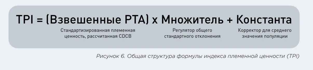 Подобно формуле NM$, формула индекса племенной ценности (TPI) включает экономически значимые признаки в виде взвешенного индекса, чтобы помочь производителям ранжировать животных на основе общей прибыльности. Формула TPI включает: 46% продуктивные признаки, 28% признаки здоровья и фер тильности и 26% признаки экстерьера. На рисунке 5 показана формула TPI, которая, по сути, представляет собой взвешенный PTA, умноженный на множитель с добавлением постоянного значения, которое описано на рисунке 6. Множитель применяется для корректировки стандартных отклонений (дисперсии) индекса, чтобы значения TPI не зависели от изменения базы, поэтому значения TPI можно сравнивать во времени. Константа добавляется для компенсации уменьшения среднего значения из-за изменения базы CDCB. По стоянное значение 2363 будет изменено на 2845 после оценки в апреле 2025 года, чтобы учесть генетиче ское улучшение за последние пять лет. Этот процесс не повлияет на рейтинг животных.