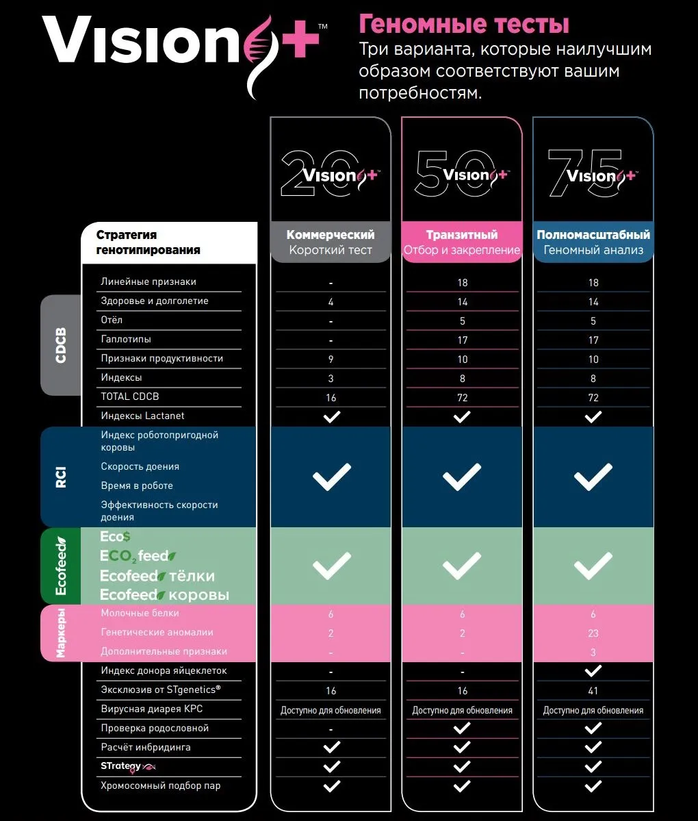 Vision+™ предоставляет эксклюзивные генетические результаты, такие как индекс роботопригодной коровы (RCI), данные Ecofeed®, комолость, ген красной масти, Eco$, A2A2, мышечная слабость, а также все геномные показатели, которые публикуют Lactanet и CDCB.